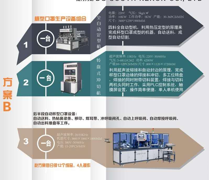 當(dāng)很多客戶打電話來問,你們有沒有杯型口罩機(jī)?我們就要花費(fèi)很多時間告訴客戶杯型口罩的生產(chǎn)工藝和流程,介紹完后,客戶才恍然大悟,原來杯型口罩機(jī)并不只是一臺機(jī)器,而是屬于一條生產(chǎn)線,分別有定型,封邊,切邊,鼻梁條貼合,頭帶焊接,移印,呼吸閥沖孔,呼吸閥焊接等多道工序。而實(shí)現(xiàn)這些工序則是由不同的機(jī)器組成,如全自動杯型定型機(jī)、杯型口罩轉(zhuǎn)盤機(jī)(負(fù)責(zé)封邊和切邊)、全自動后半段(鼻梁條貼合、頭帶焊接、移印、呼吸閥焊接等功能)。以上3臺機(jī)器是一條標(biāo)準(zhǔn)的杯型口罩生產(chǎn)線,可是如果您要是生產(chǎn)類似于3M 1860款的帶面罩的杯型口罩,那機(jī)器方案又有很大的不同,如增加面罩機(jī),打釘機(jī)等。再如果您是生產(chǎn)FFP3款的帶頭帶扣的那種杯型口罩,那又得增加耳帶扣焊接機(jī)。由此 看來,杯型口罩的生產(chǎn)不單純是杯型口罩機(jī),而確切的說應(yīng)該叫杯型口罩生產(chǎn)線。