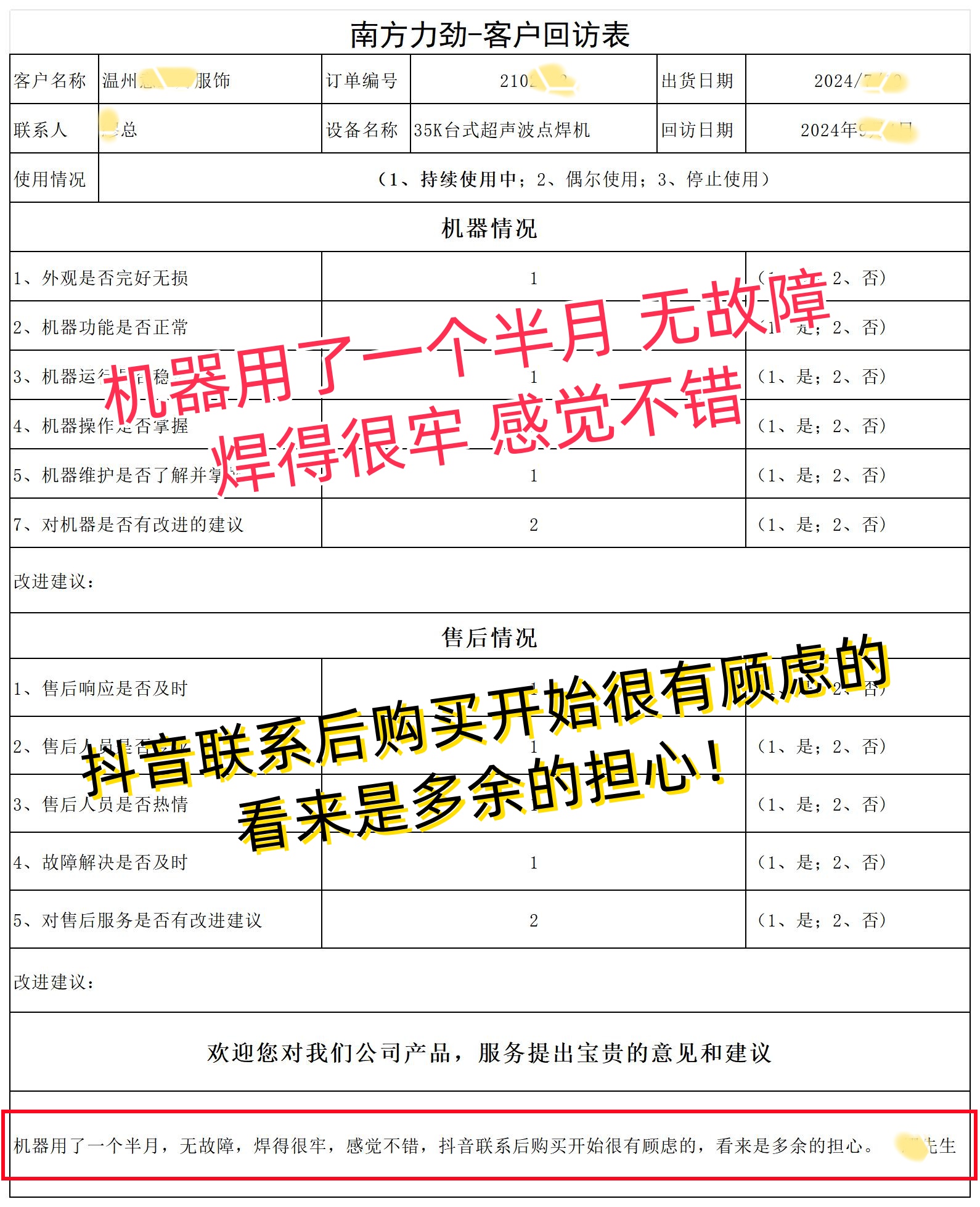 “機器用了一個半月,無故障,焊得很牢,感覺不錯,抖音聯(lián)系后購買開始很有顧慮的,看來是多余的擔心?!?客戶的這句評價,如同璀璨的星光,照亮了超聲波點焊機的卓越品質(zhì)之路。