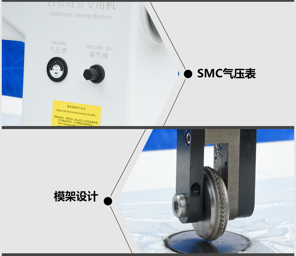 本機采用超聲波系統(tǒng),操作方便,工作效率高,為目前流行的無縫內(nèi)衣(文胸、內(nèi)褲等)而設(shè)計的設(shè)備,切邊柔軟無散邊,縫合強度高,外形美觀。
