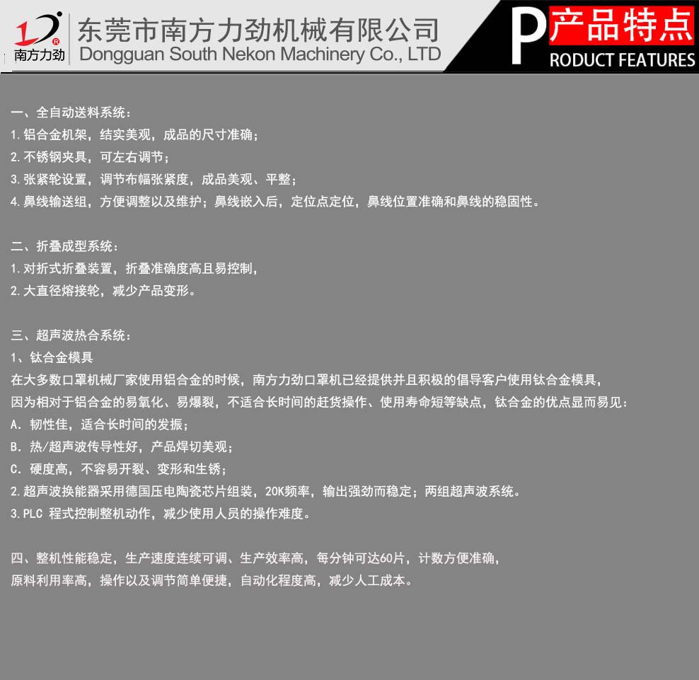 東莞市南方力勁機械有限公司是一家大型超聲波設(shè)備生產(chǎn)企業(yè),主營全自動口罩機,平面口罩機,折疊口罩機,杯型口罩機,柳葉型口罩機,超聲波裥棉機,汽車腳墊壓花機,超聲波剪切機,超聲波分條機,超聲波花邊機,超聲波縫合機,超聲波釘珠機,皮革沖孔機,條形帽機,鞋套機等設(shè)備,同時可為客戶提供非標定制的自動化設(shè)備,是國家高新技術(shù)企業(yè)。聯(lián)系電話:400-600-8299